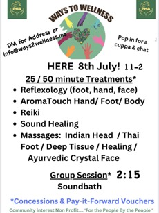 Ways to Wellness Open Day… exceeded our hopes and expectations. Thank you for those joining us in different ways to take care of our wellbeing. All our 121 treatments were booked and there was excellent uptake in the talks and group sessions. So much curiosity piqued and awareness raised. The final session sound bath almost lifted the roof. We are immensely humbled and simultaneously grateful. All this was made possible by massive amounts of teamwork and trust! We truly believe this to be the way forward… community rising to meet community needs. Thank you everyone.